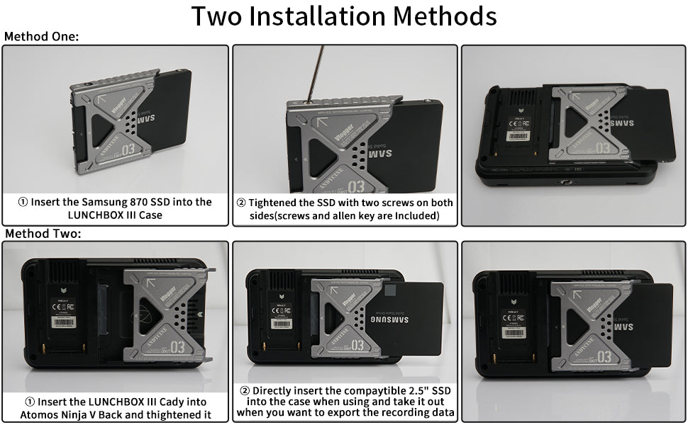 1.Tight the ssd onto luncbox III with screws,and slide into the atomos ninja v sink