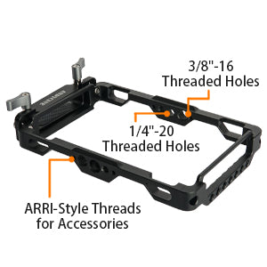 The cage mounts to the monitor by two 1/4’’-20 screws on the top and bottom. Across the cage features multiple 1/4’’-20, 3/8’’-20 holes across all sides as well as to the rear side of the monitor for ultimate flexibility in mounting options.