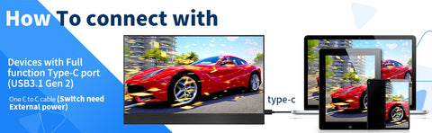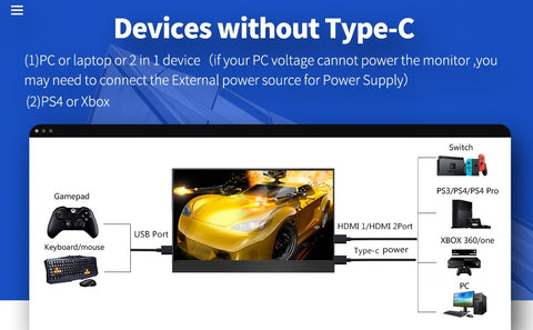 Video -- Plug one end of the HDMI /Type-C cable into your device and connect the other end to the Portable Monitor HDMI/Type port.
